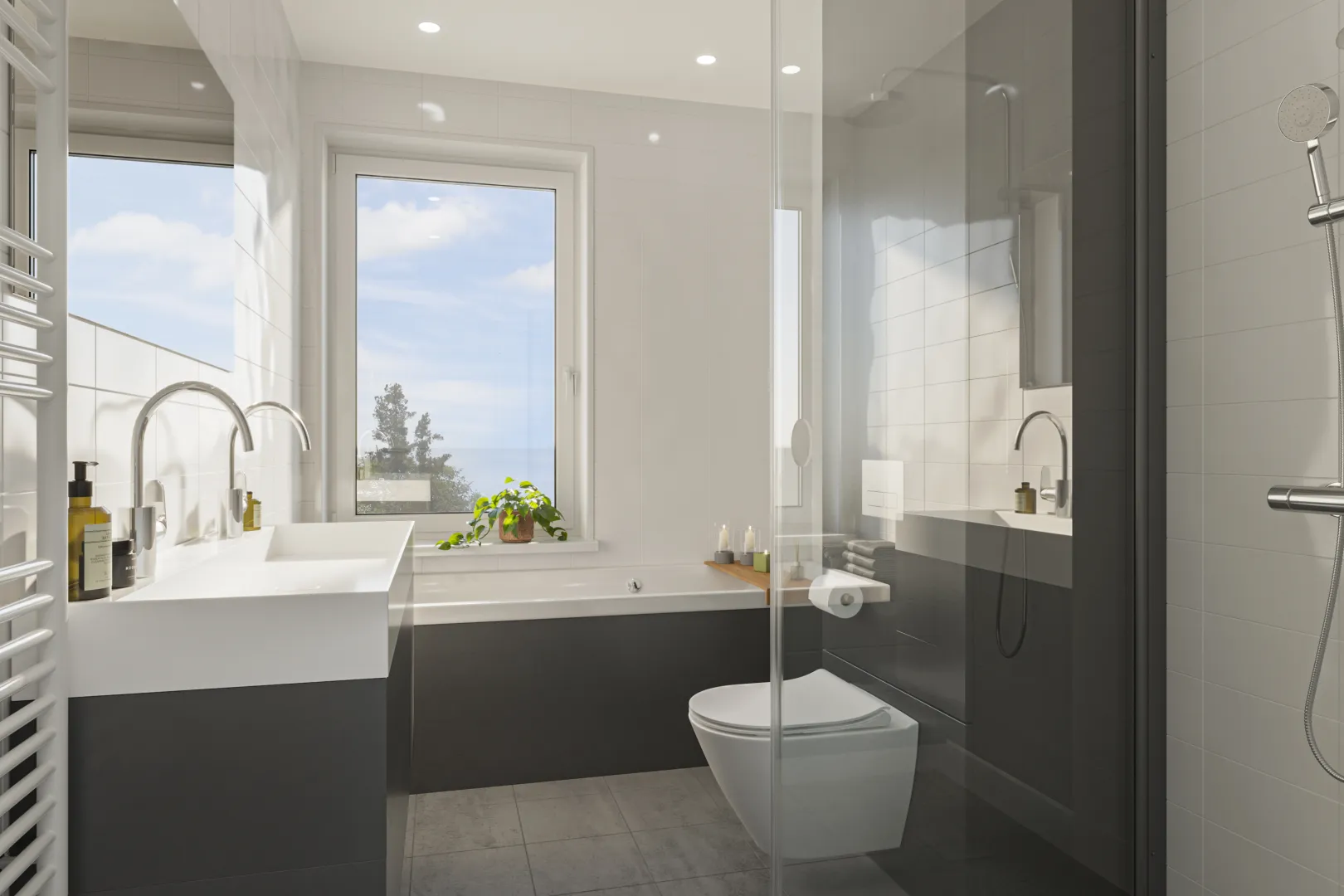 In de luxe badkamer is een badkamermeubel met spiegel, hangend toilet, inloop douche met douchescherm en zelfs een bad aanwezig. Het badkamermeubel wordt bij deze woning uitgevoerd in een houtlook (niet grijs, zoals op de impressie).