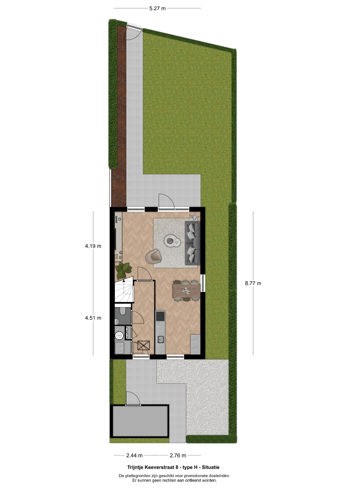 Bij deze woning is geen eigen parkeerplaats inbegrepen in de voortuin. Parkeren doet u (gratis) op het openbare terrein voor de woning. De achtertuin wordt alvast voor u ingericht met een terras aan de woningzijde, graszoden en een hekwerk als erfafscheiding.